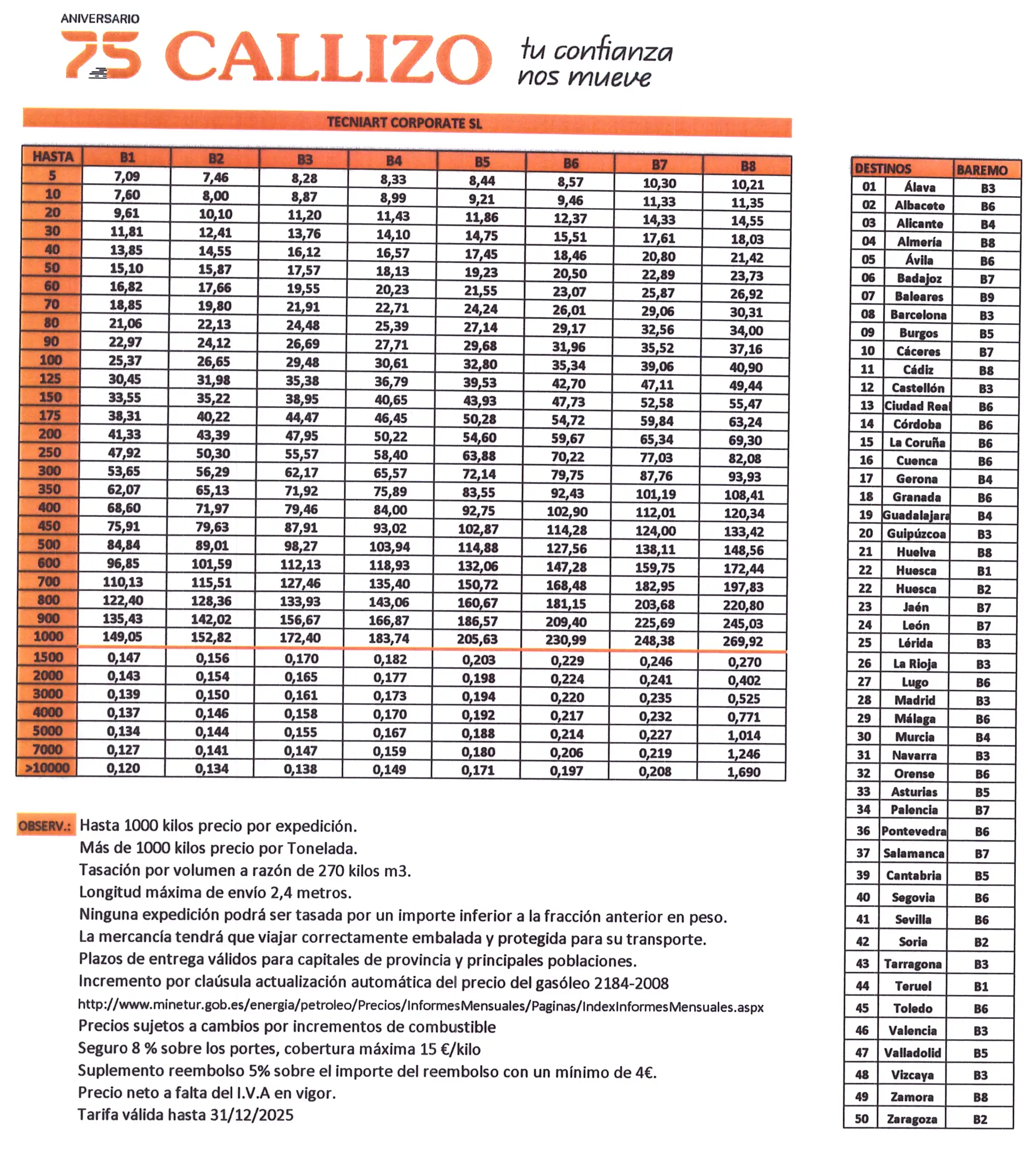 Los gastos de envío se encuentran incluidos en los precios finales de los productos tal y como se muestran en el Sitio Web. Así, realiza los servicios de entrega y/o envío a través de: Transportes Callizo. (ver tabla de precios)