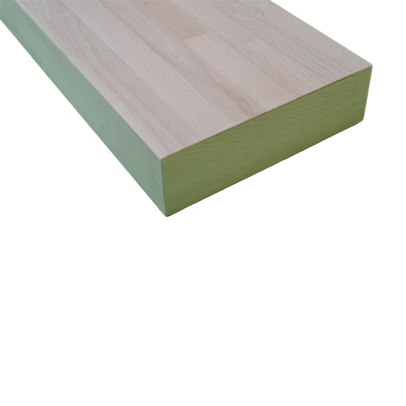 La haya vaporizada, ensamblada con técnica finger-joint, da forma a un peldaño firme, estable y visualmente impecable.